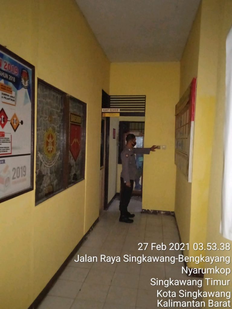 Hal ini juga yang dilakukan di Polsek Singkawang Timur melalui Pelayanan Piket Sentra Pelayanan Kepolisian Terpadu yang bertugas pada hari ini Kamis Ka Spk Ru II Aiptu Sigit,P.SH.dengan rutin mengecek mako Polsek Singkawang Timur, Instalasi Listrik dan Tahanan Sabtu tanggal ( 27/02/2021).