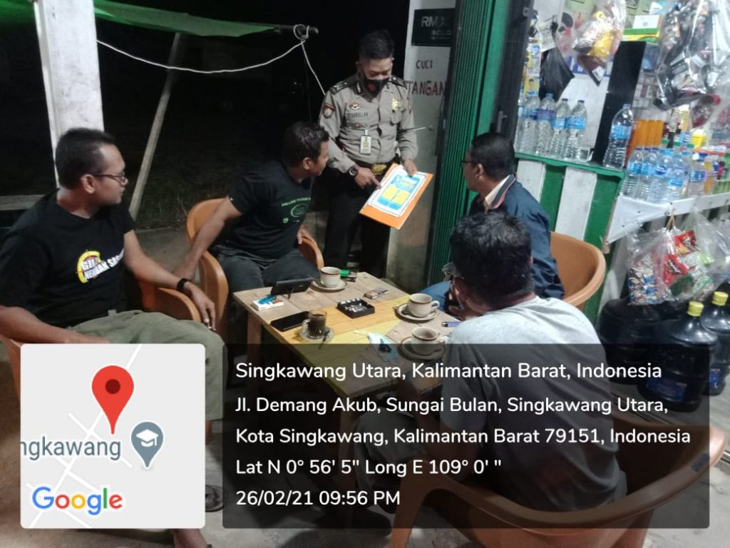 Polres Singkawang Polsek Singkawang Utara dalam rangka menjaga Kamtibmas dan memberikan teguran terhadap masyarakat yang melanggar protokol kesehatan dilaksanakan patroli pada Hari Jum’at, 26-02-2021 Malam hari