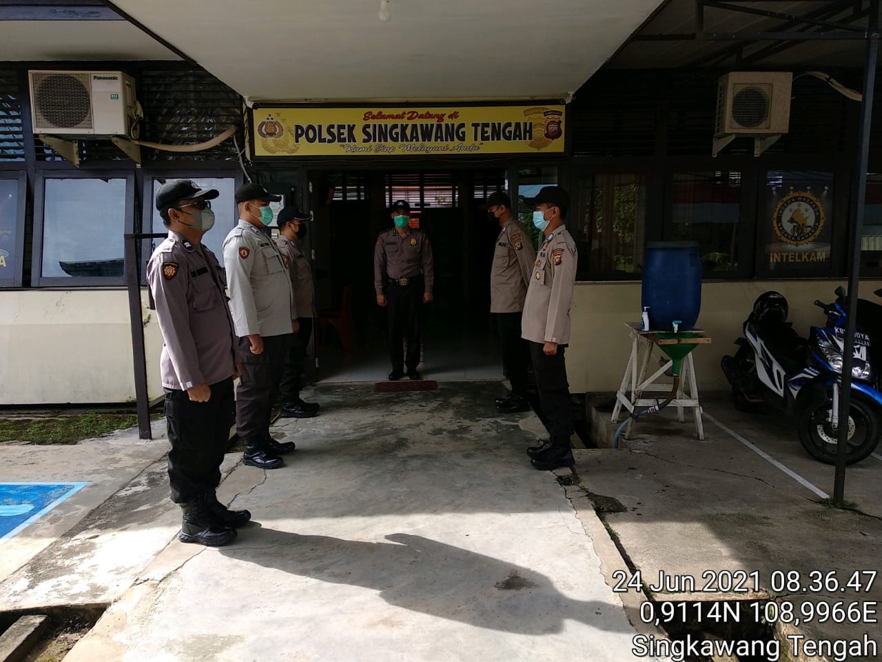 Polres Singkawang – Polsek Singkawang Tengah. Ka SPK Regu II Aipda Nashrullah pimpin kegiatan serah terima tugas penjagaan, tugas penjagaan dilaksanakan selama 1×24 Jam, serah terima penjagaan tersebut dilaksanakan di Mako Polsek Singkawang Tengah di Jl. Jend Sudirman Gg. RDKS Singkawang, Kamis Pagi (24-06-2021).