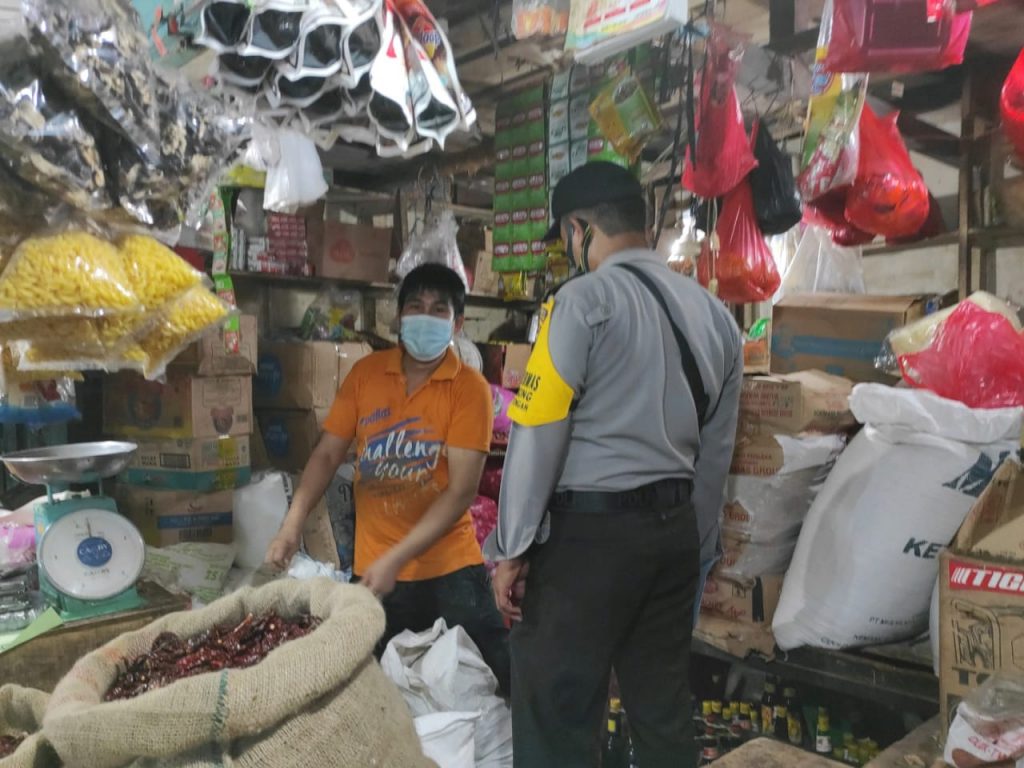 Polres Singkawang – Polsek Singkawang Tengah , Bhabinkamtibmas Polsek Singkawang Tengah yang bertugas di Kelurahan Condong Bripka Harri sambangi pemilik Toko Sembako, Bhabinkamtibmas lakukan pengecekan terhadap ketersediaan dan harga Sembako di Pasar Beringin Kelurahan Condong Kecamatan Singkawang Tengah, Senin ( 28-06-2021).