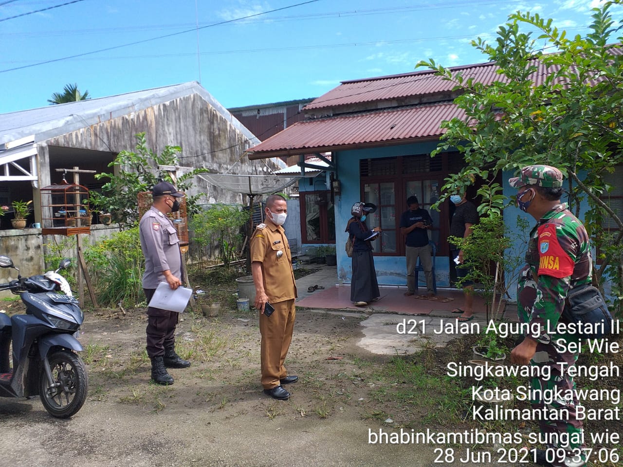 Bhabinkamtibmas Polsek Singkawang Tengah yang bertugas di Kelurahan Sungai Wie Bripka Herry bersama tiga pilar , Lurah Bpk Anwar, S.Sos, Babinsa Sungai Wie Kopda Nababan, dan Petugas Puskesmas Ibu Titin melaksanakan giat tracing di Kelurahan Sungai Wie Kecamatan Singkawang Tengah, Senin (28/06/2021).