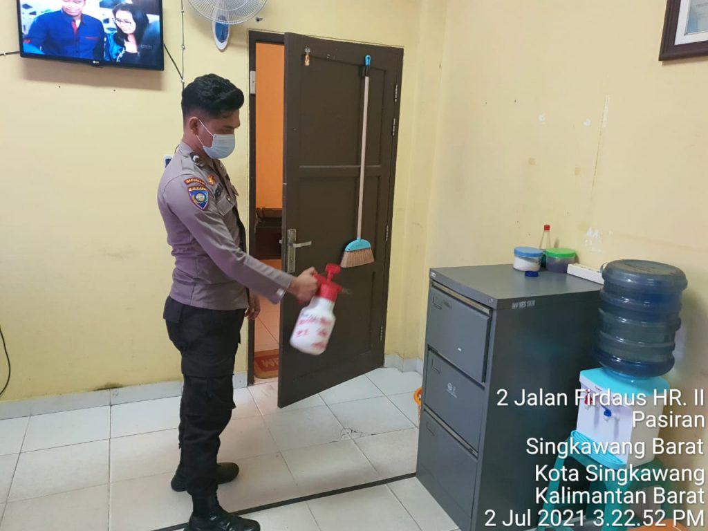 Sat Binmas Polres Singkawang semprot ruang dengan Disinfektan sebelum pulang kantor