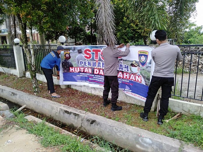 Dalam hal ini satbinmas polres Singkawang melakukan pemasangan spanduk Karhutla di jl.Padat karya Kel.sui Wie Kota Singkawang,