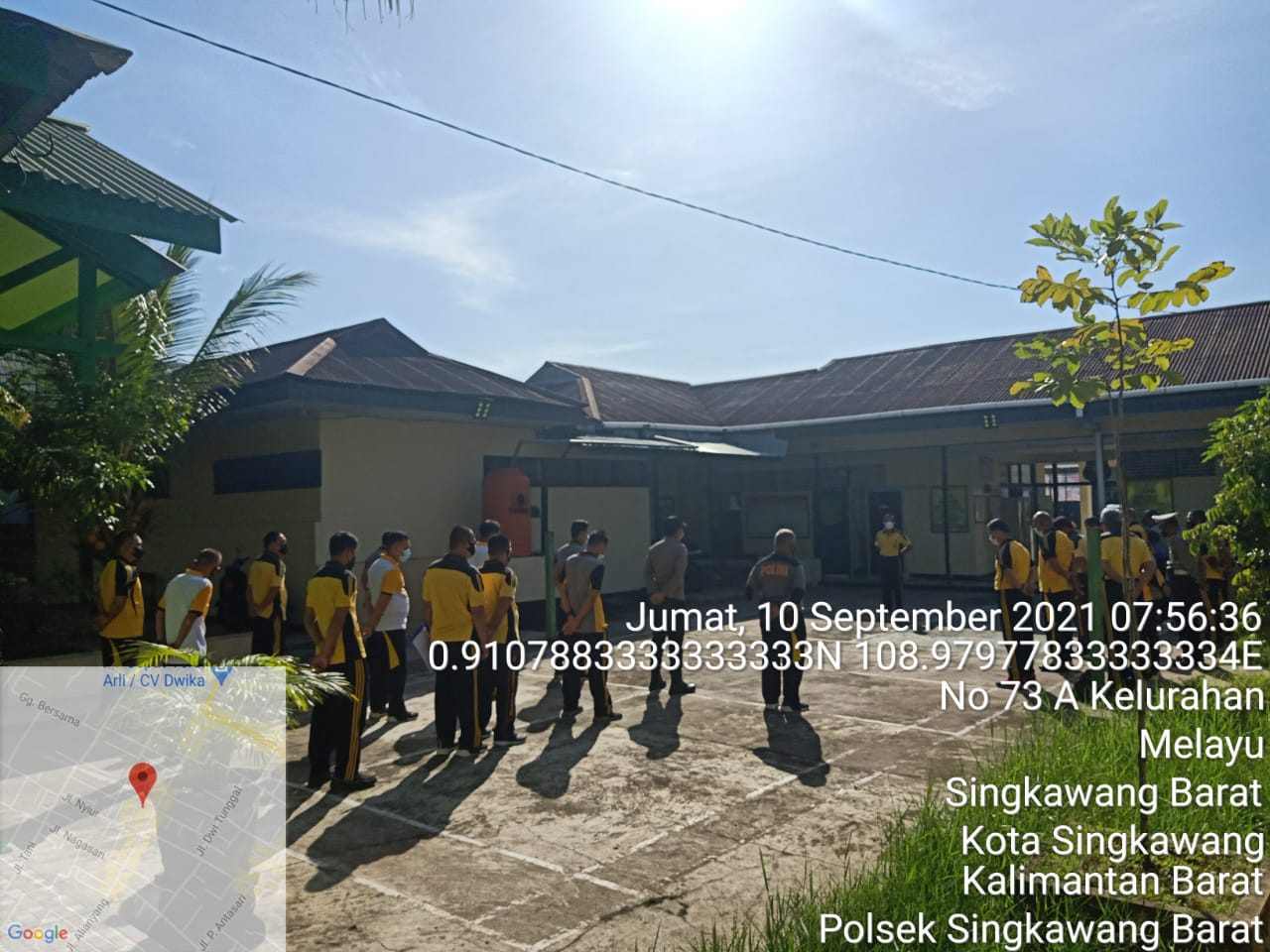 Polres Singkawang Polsek Singkawang Barat pelaksanaan apel Pagi pada hari Jum’at, 10 September 2021 pukul 08.00 wib dipimpin oleh Kompol Charles Sitorus, SH