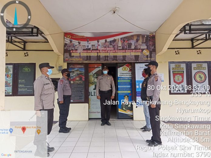 Polda Kalbar – Polres Singkawang – Polsek Singkawang Timur, bertempat di Mako penjagaan Polsek Singkawang Timur, KaSpk Singkawang Timur Pimpin serah terima penjagaan dari piket jaga lama kepada piket jaga baru pukul 08.00 wib, sabtu (30/10/2021).