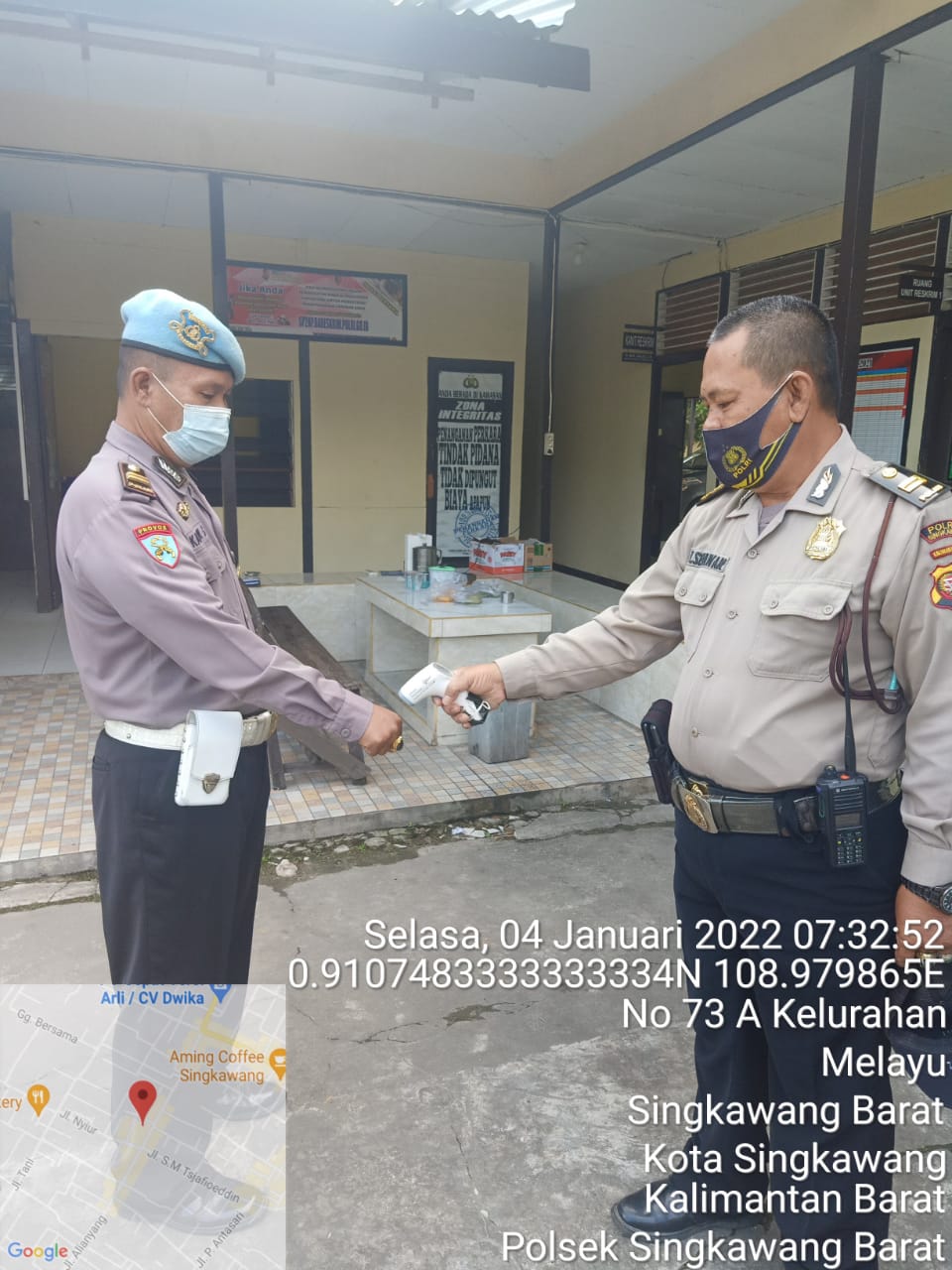Polres Singkawang Polsek Singkawang Barat unit Provost melaksanakan cek suhu tubuh kepada seluruh personil Polsek Singkawang Barat sebelum melaksanakan aktivitas pada hari Selasa, 04 Januari 2022 pukul 07.15 wib terlebih dahulu melaksanakan protokol kesehatan mencuci tangan dengan menggunakan sabun dan air bersih serta mengalir, menggunakan masker, mengukur suhu tubuh