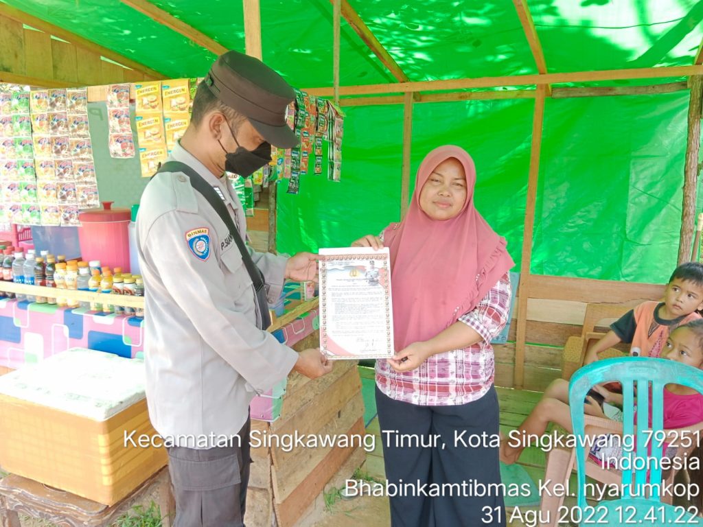 Polda Kalbar Polres Singkawang Polsek Singkawang Timur.-Bhabinkamtibmas Singkawang Timur, telah melaksanakan Sosialisasikan dan Penyebaran Himbauan Berupa Maklumat Kapolda kalbar sesuai dengan ST Bapak Kapolres Singkawang No. ST/79/IV/ops 1.3/2022 tanggal 18 April 2022 ttg sosialisasi maklumat Kapolda Kalbar, tentang larangan dan sangsi hukum bagi pembakar hutan dan lahan.rabu ( 31/08/2022 ).