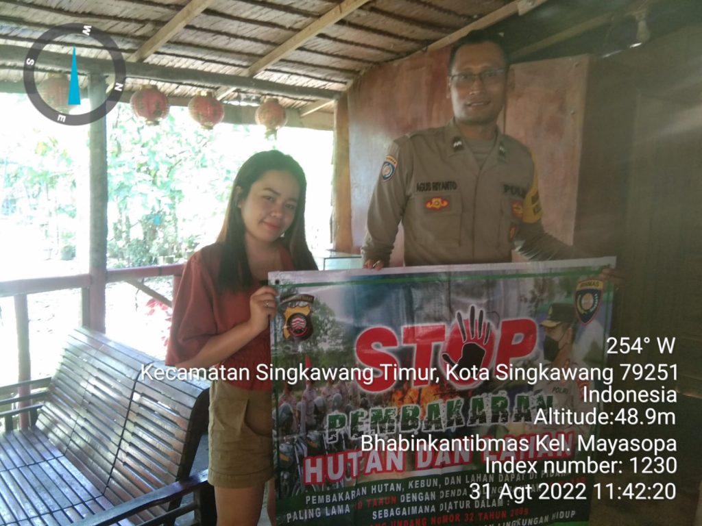 Bhabinkamtibmas Aipda Agus Riyanto Sambangi Warga sampaikan himbauan tentang Larangan dan Sanksi terkait Pembakaran Hutan dan Lahan ( Karhutla ), di Kelurahan Maya sopa Kec. Singkawang Timur, rabu tanggal ( 31/08/2022).