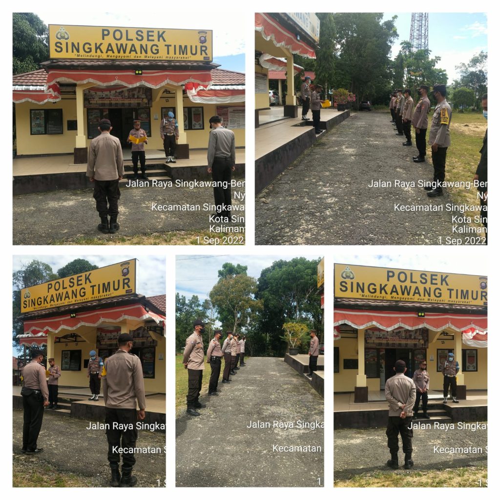 “POLRES SINGKAWANG POLDA KALBAR”,POLSEK SINGKAWANG TIMUR – Kegiatan apel pagi merupakan kegiatan rutin yang wajib dilaksanakan oleh setiap anggota Polri, Polsek Singkawang Timur tetap melaksanakan apel pagi yang dipimpin oleh Waka Polsek Singkawang Timur, kamis ( 01/09/2022).
