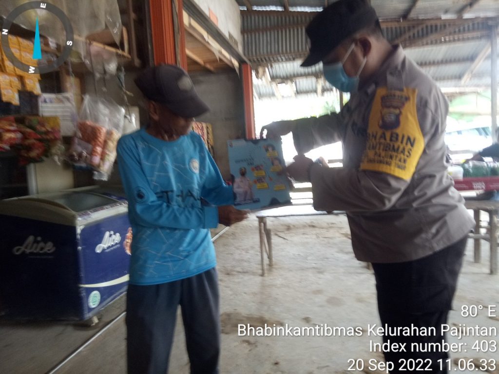 “POLRES SINGKAWANG POLDA KALBAR. – Patuhi Protokol Kesehatan Bhabinkamtibmas Kelurahan pajintan Brigpol Pran Jonathan melaksanakan kegiatan himbauan kepada warga untuk tetap Patuhi protokol kesehatan, kegiatan ini bertujuan memutus mata rantai penyebaran covid 19, Selasa ( 20/09/2022 ).