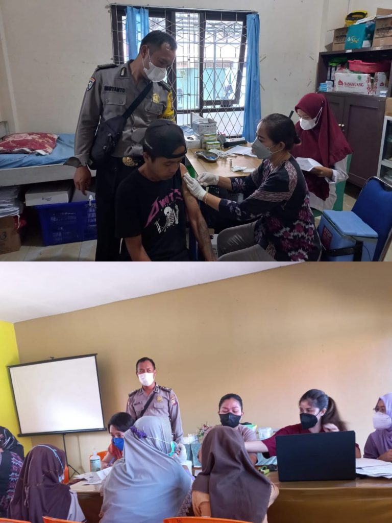 Bhabinkamtibmas Polsek Singkawang Tengah yang bertugas di Kelurahan Condong Aipda Harry melaksanakan monitoring dan pengamanan kegiatan Vaksinasi Covid-19 di PKM Singkawang Tengah 1 Jl. Muslimin Ismail Kel. Condong Kec. Singkawang Tengah Kota Singkawang, Rabu (21/09/2022).