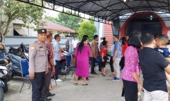 Singkawang, Polda Kalbar – Polres Singkawang, Polsek Singkawang Barat, Polri melaksanakan pengamanan hari Minggu tanggal 6 Agustus 2023, pukul 09.00 Wib s/d 12.00 wib bertempat di Gereja Huria Kristen Batak Protestan ( HKBP ) Kota Singkawang, Jl. Firdaus H. Rais No. 76, Kel. Pasiran Kec. Singkawang Barat telah dilaksanakan kegiatan Pengamanan ibadah dengan tema “makanan dan minuman adalah pemberian Allah“ yang dipimpin oleh Pendeta Togar Hasugian S.Th., MM, Jumlah jemaat : ± 97 orang.