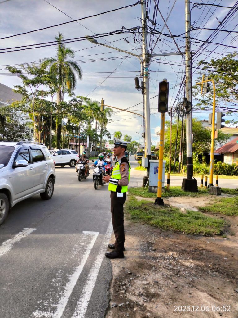 Personil Satlantas Polres Singkawang melaksanakan kegiatan ploting point pagi hari dan penjagaan di daerah ramai aktifitas lalu lintas di Kota Singkawang. Rabu (6/12/2023).