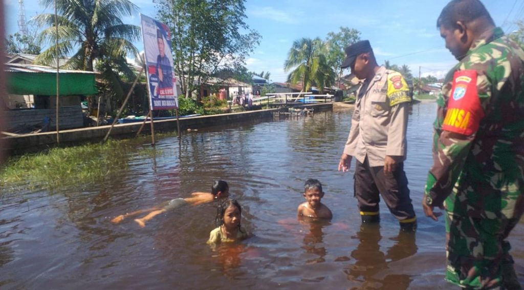 Bhabinkamtibmas Kel. Sungai Garam Aipda Sodikin serta Babinsa Kopda Syarif Anwar melaksanakan monitoring banjir yang terjadi di Kel. Sungai Garam akibat curah hujan tinggi, Rabu (6/12/2023).