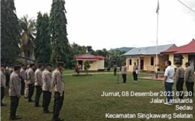 Singkawang, Polda Kalbar – Polres Singkawang – Polsek Singkawang Selatan, Kanit Bimmas Polsek Singkawang Selatan Ipda Mardiono, pimpin apel pagi di halaman Mapolsek Singkawang Selatan. Jumat(08/12/2023).