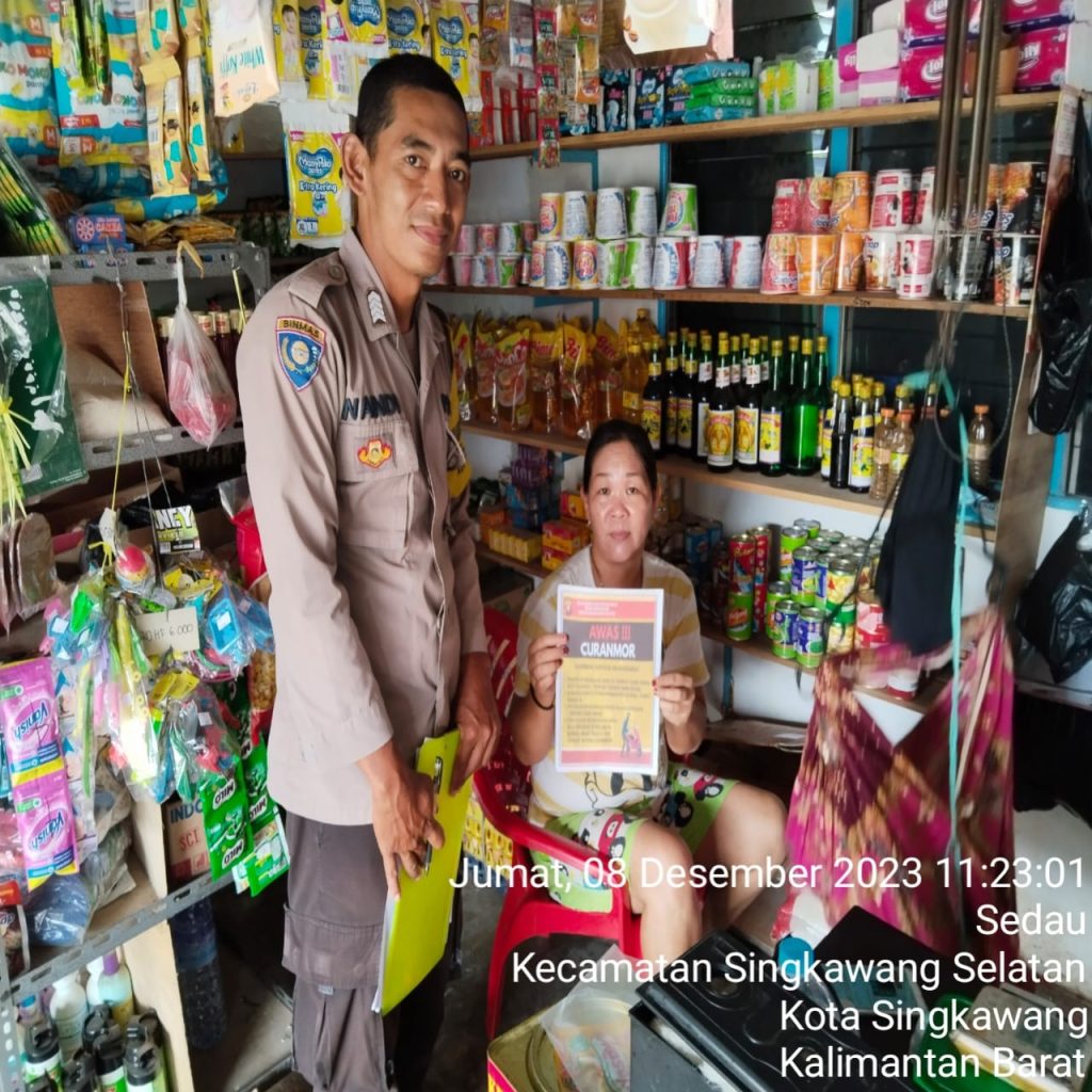 Bhabinkamtibmas Sedau Polsek Singkawang Selatan menyambangi warga binaannya sebagai salah satu upaya mencegah gangguan kamtibmas agar tidak menjadi gangguan nyata dan Bhabinkamtibmas selalu hadir setiap ada kegiatan masyarakat untuk mendengar keluhan dan informasi wilayah binaannya. Jumat(08/12/2023).