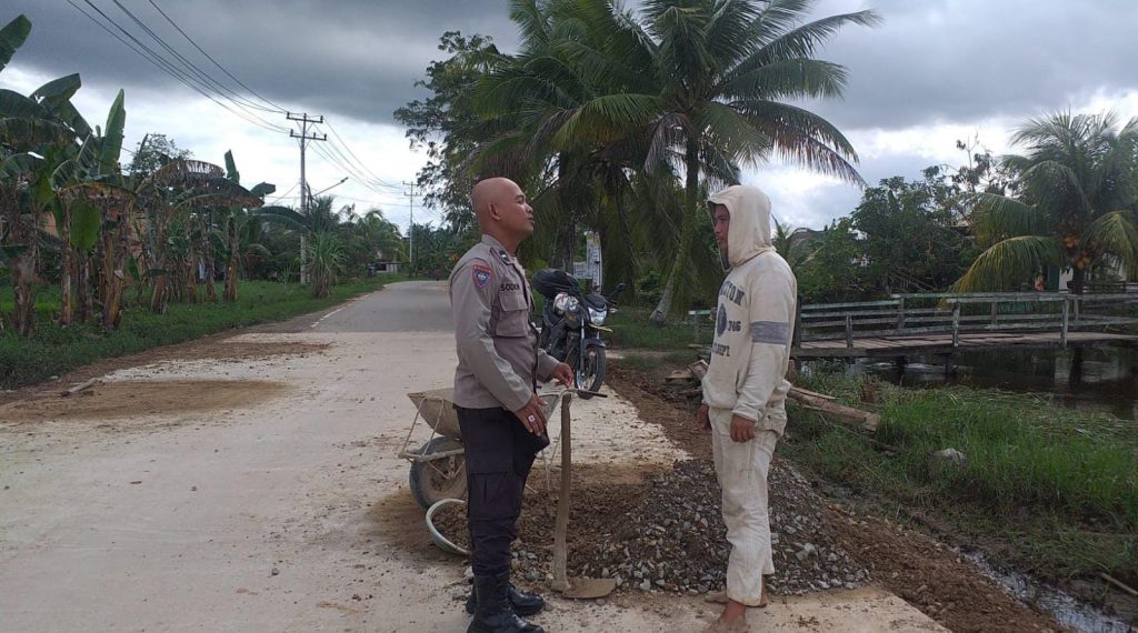 Bhabinkamtibmas Kelurahan Sungai Garam Polsek Singkawang Utara Aipda Sodikin melaksanakan sambang dan berikan himbauan kepada pekerja jalan agar utamakan Keselamatan diri saat bekerja.